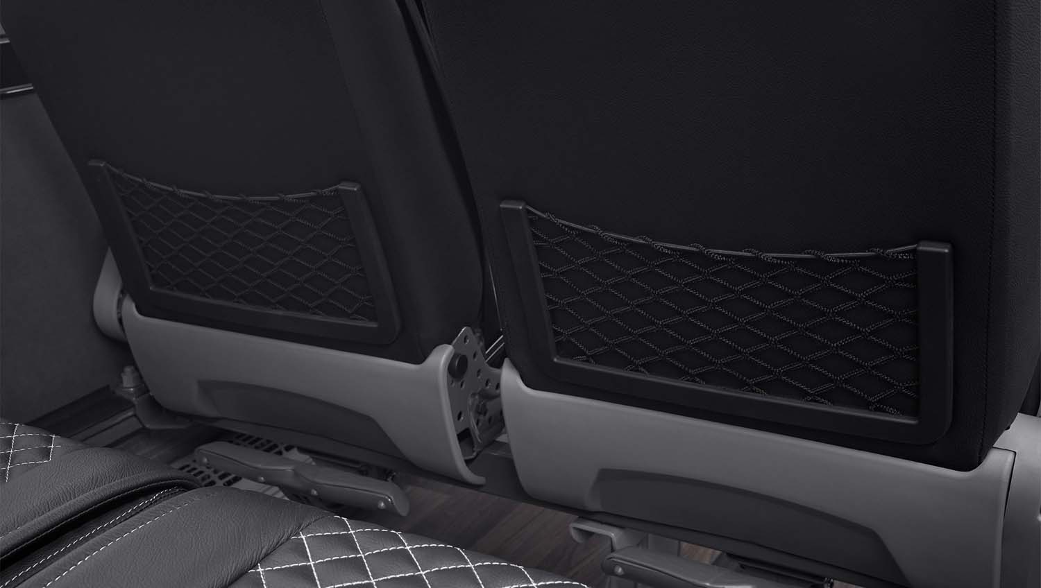 The redesigned restroom is optimized for ergonomics, and a stylish mirror enhances aesthetics. Seating is well-appointed with dual USB-A and USB-C power outlets, cup holders, magazine nets, footrests, and a variety of premium leather and fabric upholstery options.